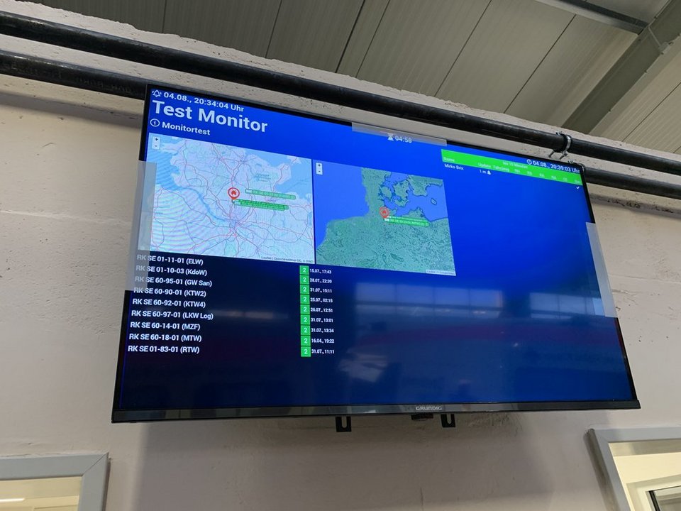 Nachdem sich die finale Montage durch Einsätze und die Urlaubszeit leider verzögert hat, ist es nun aber geschafft und der Monitor hat seinen Platz in der Halle bekommen. Gut sichtbar an zentraler Stelle hinter den Fahrzeugen informiert das Display nun automatisch über das Einsatzszenario, den Ort und stellt auf einer Karte auch die Route für die Anfahrt dar. Alle alarmierten Kräfte, die sich per Handy-App zurückmelden werden mit der verbleibenden Zeit bis zum Eintreffen an der Wache ebenfalls dargestellt und laufend aktualisiert.